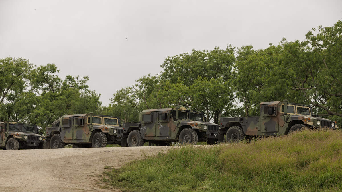 Military-style humvees are parked along the border wall in Brownsville, Texas. Photo: Getty Images