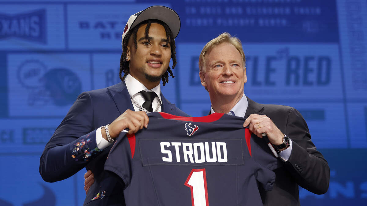 C.J. Stroud poses NFL Commissioner Roger Goodell after being selected second overall by the Houston Texans during the first round of the 2023 NFL Draft at Union Station on April 27, 2023 in Kansas City, Missouri. Photo: Getty Images