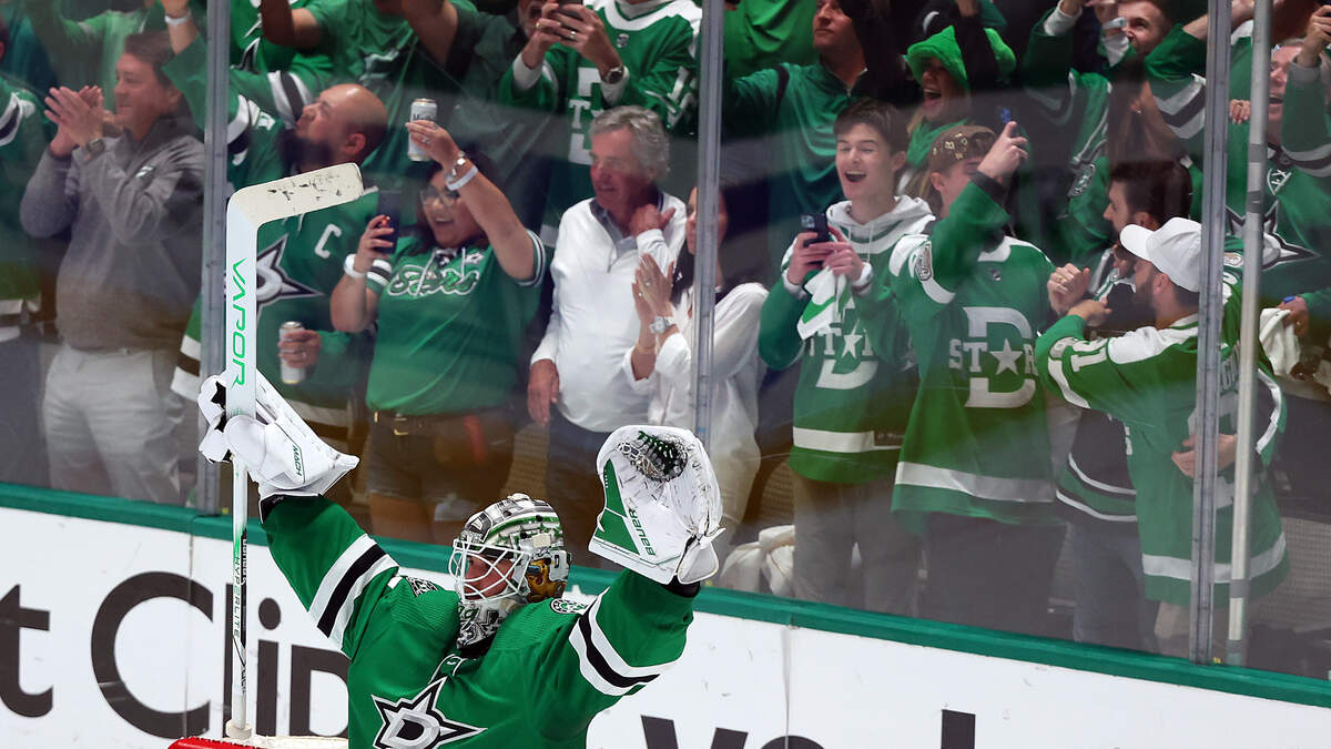 Jake Oettinger #29 of the Dallas Stars celebrates after the win over the Seattle Kraken in Game Seven of the Second Round of the 2023 Stanley Cup Playoffs at American Airlines Center on May 15, 2023 in Dallas, Texas. Photo: Getty Images