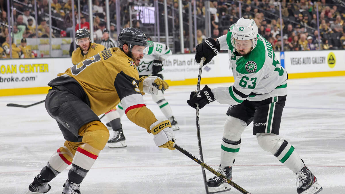 Evgenii Dadonov #63 of the Dallas Stars shoots against Brayden McNabb #3 of the Vegas Golden Knights in the third period of Game Two of the Western Conference Final of the 2023 Stanley Cup Playoffs at T-Mobile Arena on May 21, 2023 in Las Vegas, Nevada. Photo: Getty Images