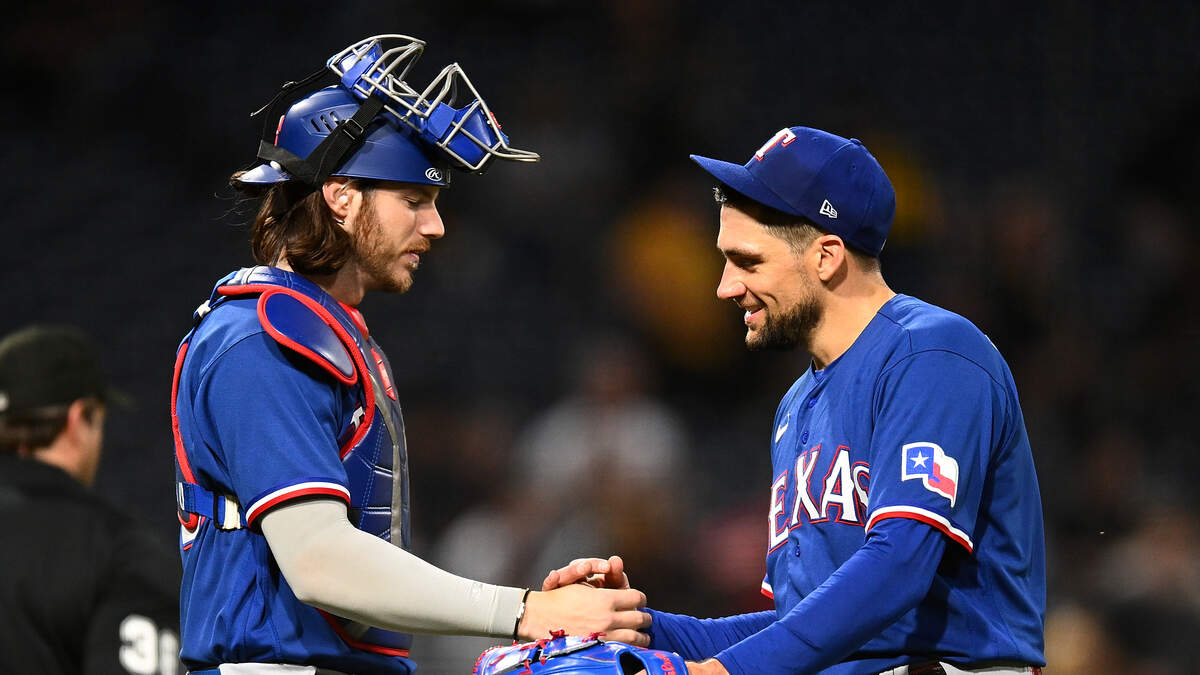 Pitcher Nathan Eovaldi #17 of the Texas Rangers celebrates with Jonah Heim #28 after throwing a 6-1 complete game against the Pittsburgh Pirates at PNC Park on May 23, 2023 in Pittsburgh, Pennsylvania.Photo: Getty Images
