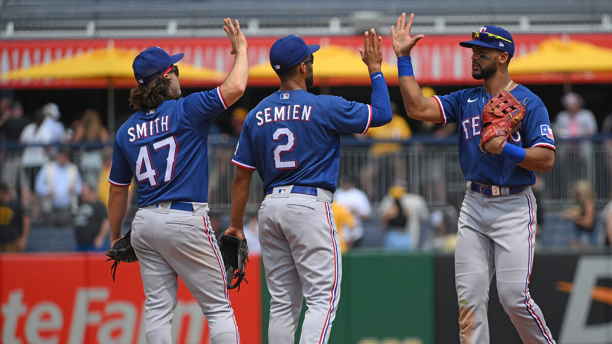 Leody Taveras #3 of the Texas Rangers celebrates with Marcus Semien #2 and Josh Smith #47 after the final out in a 3-2 win over the Pittsburgh Pirates during the game at PNC Park on May 24, 2023 in Pittsburgh, Pennsylvania.Photo: Getty Images