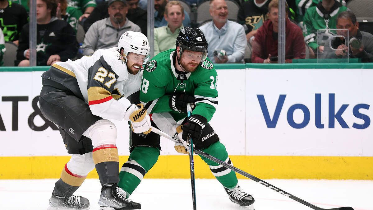 Max Domi #18 of the Dallas Stars and Shea Theodore #27 of the Vegas Golden Knights battle for the puck in Game Three of the Western Conference Final of the 2023 Stanley Cup Playoffs at American Airlines Center on May 23, 2023 in Dallas, Texas. Photo: Getty Images