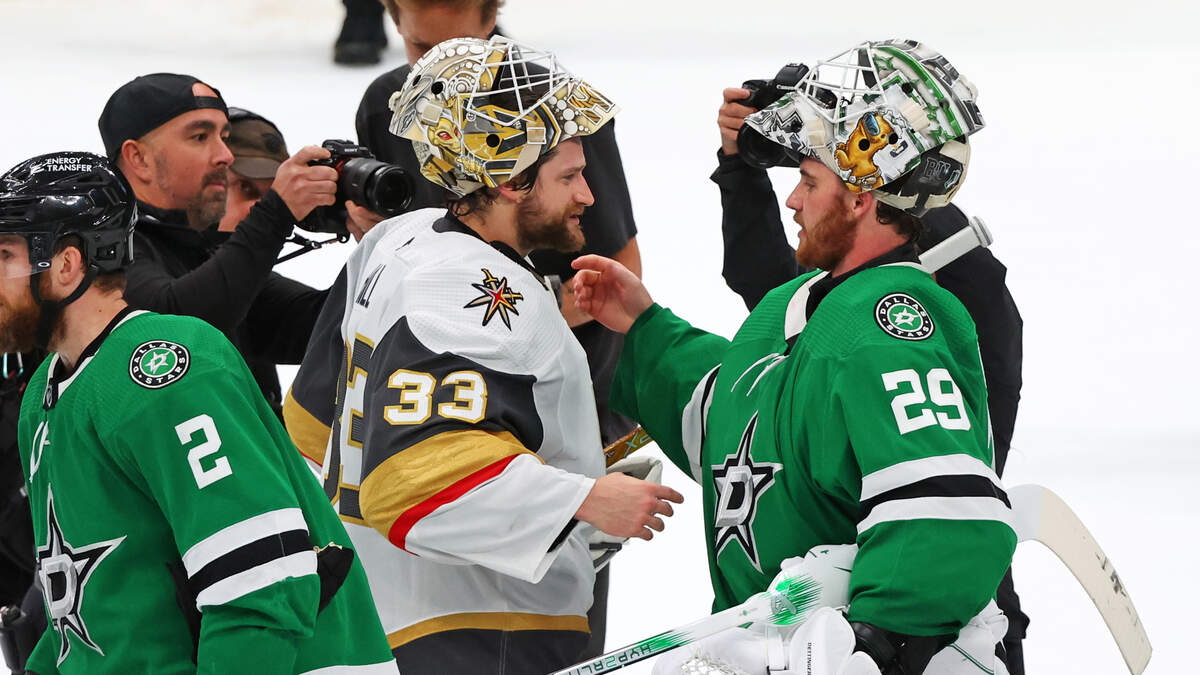 Jake Oettinger #29 of the Dallas Stars greets Adin Hill #33 of the Vegas Golden Knights after the Vegas Golden Knights beat the Dallas Stars 6-0 in Game Six of the Western Conference Final of the 2023 Stanley Cup Playoffs at American Airlines Center on May 29, 2023 in Dallas, Texas. Photo: Getty Images