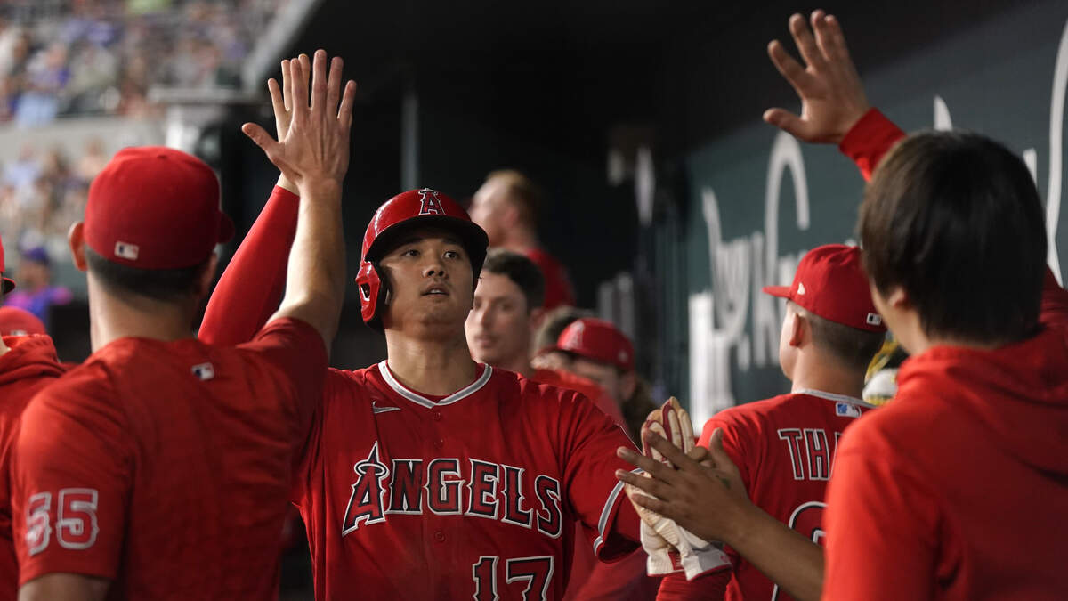 Shohei Ohtani #17 of the Los Angeles Angels is congratulated by teammates after scoring a run during the sixth inning against the Texas Rangers at Globe Life Field on June 13, 2023 in Arlington, Texas.Photo: Getty Images