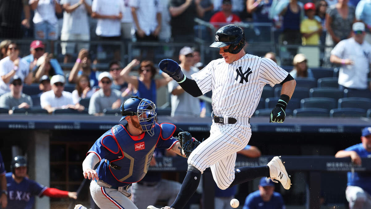 Harrison Bader #22 of the New York Yankees scores a run off a single by Giancarlo Stanton #27 in the eighth inning against the Texas Rangers during their game at Yankee Stadium on June 25, 2023 in Bronx borough of New York City. Photo: Getty Images