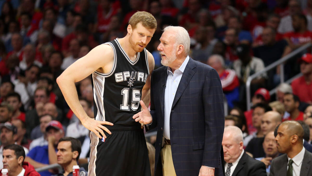 Head coach Gregg Popovich and Matt Bonner #15 of the San Antonio Spurs confer as they play the Los Angeles Clippers during Game Five of the Western Conference quarterfinals of the 2015 NBA Playoffs at Staples Center on April 28, 2015 in Los Angeles, California. The Spurs won 111-107. Photo: Getty Images