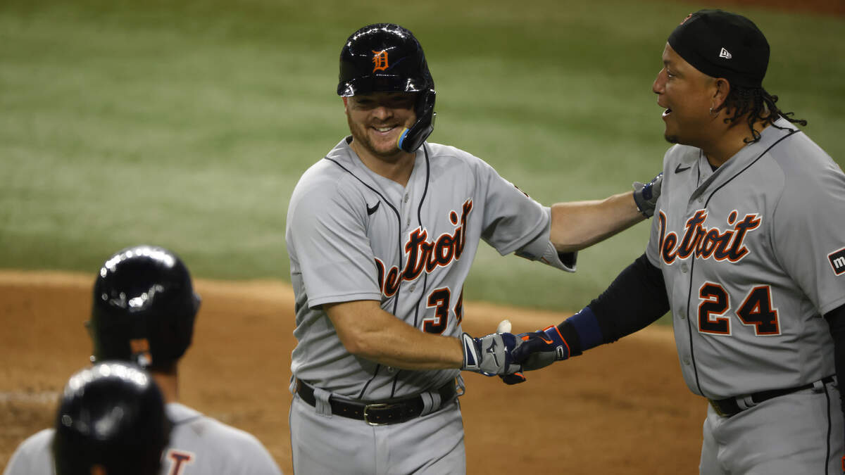 Jake Rogers #34 of the Detroit Tigers celebrates with teammate Miguel Cabrera #24 after hitting a two run home run against the Texas Rangers during the sixth inning at Globe Life Field on June 26, 2023 in Arlington, Texas. Photo: Getty Images