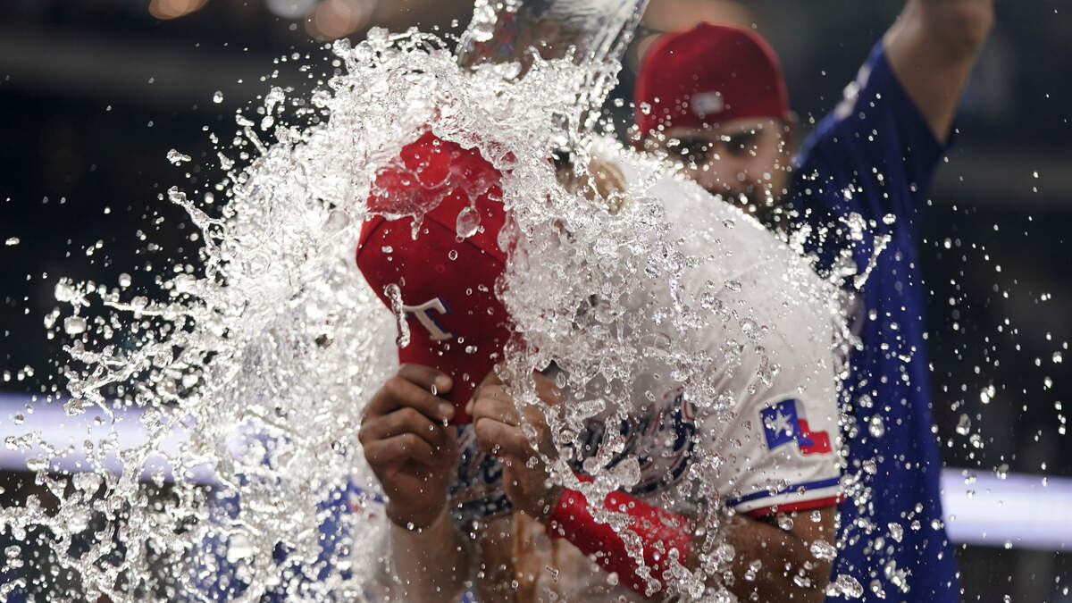 Ezequiel Duran #20 of the Texas Rangers, who hit a go-ahead solo home run in the eighth inning, is doused with water by Martin Perez #54 after the game against the Detroit Tigers at Globe Life Field on June 27, 2023 in Arlington, Texas. Photo: Getty Images