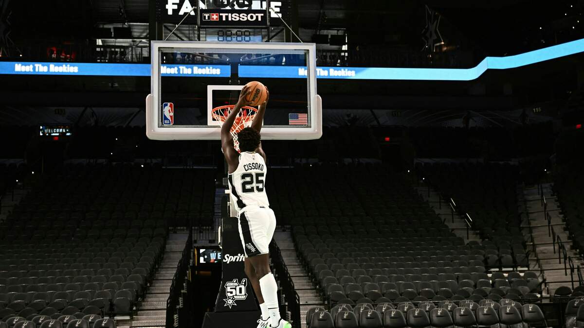 French basketball player Sidy Cissoko demonstrates his skills following a news conference introducing the Spurs 2023 Draft Class, at the AT&T Center in San Antonio, Texas, on June 24, 2023. Photo: Getty Images