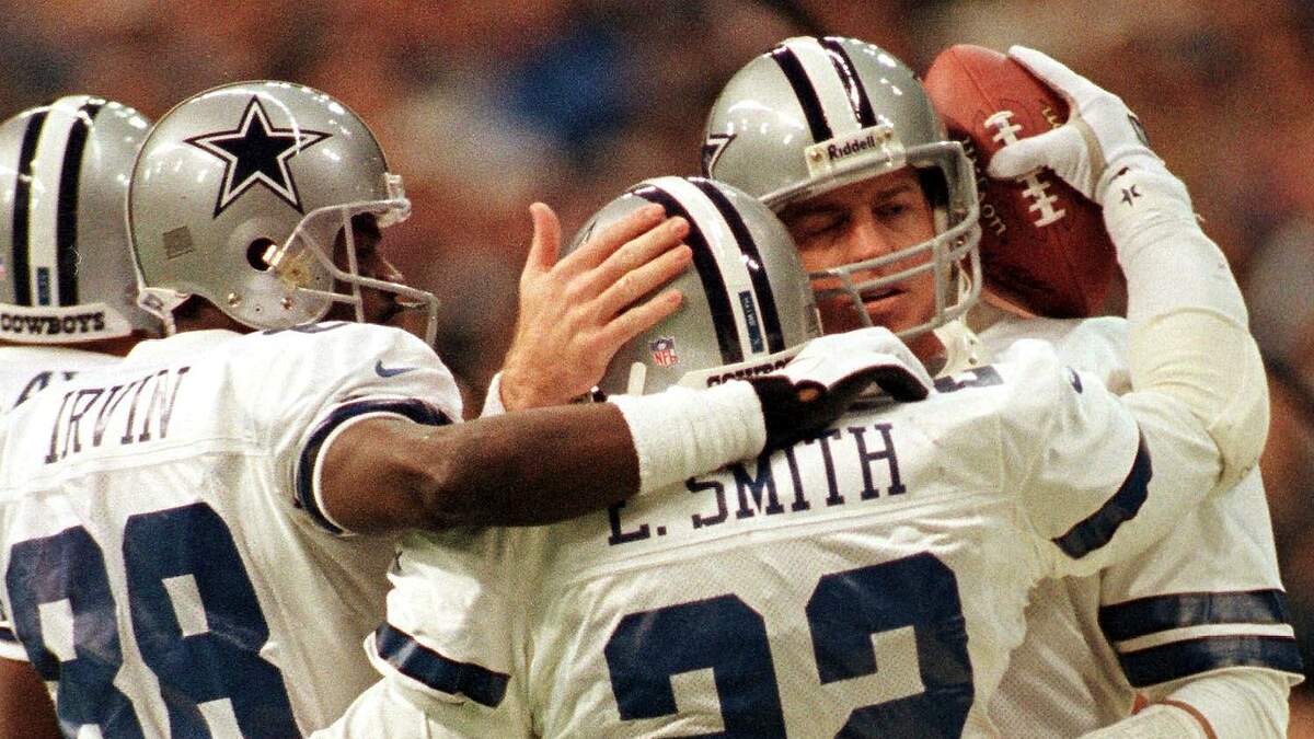 Emmitt Smith of the Dallas Cowboys receives congratulations from teammates Michael Irvin (L) and Troy Aikman (R) after breaking the NFL career touchdown record against the Washington Redskins at Texas Stadium in Irving, Texas. Photo: Getty Images