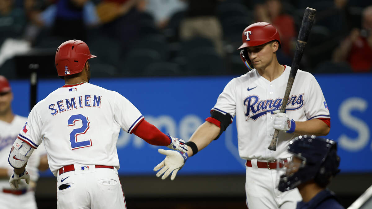Marcus Semien #2 is congratulated by Corey Seager #5 of the Texas Rangers after hitting a solo home run against the Tampa Bay Rays in the third inning at Globe Life Field on July 18, 2023 in Arlington, Texas. Photo: Tim Heitman / Getty Images Sport / Getty Images