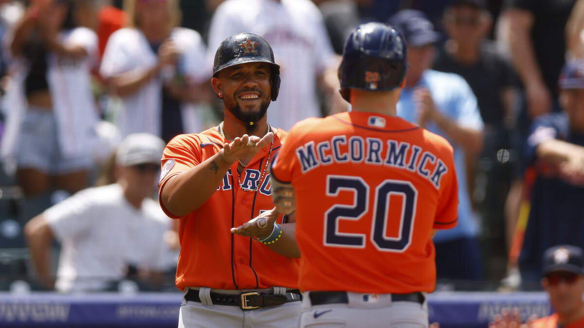 Jose Abreu #79 of the Houston Astros congratulates Chas McCormick #20 at home plate after he hit a two-run home run in the sixth inning at Coors Field on July 19, 2023 in Denver, Colorado.Photo: Justin Edmonds / Getty Images Sport / Getty Images