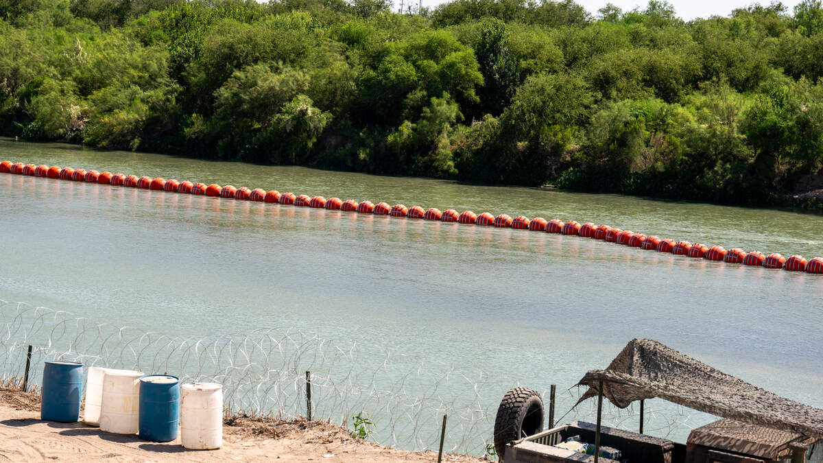 View of a string of buoys placed on the water along the Rio Grande border with Mexico in Eagle Pass, Texas, on July 15, 2023, to prevent illegal immigration entry to the US. The buoy installation is part of an operation Texas is pursuing to secure its borders.Photo: SUZANNE CORDEIRO / AFP / Getty Images