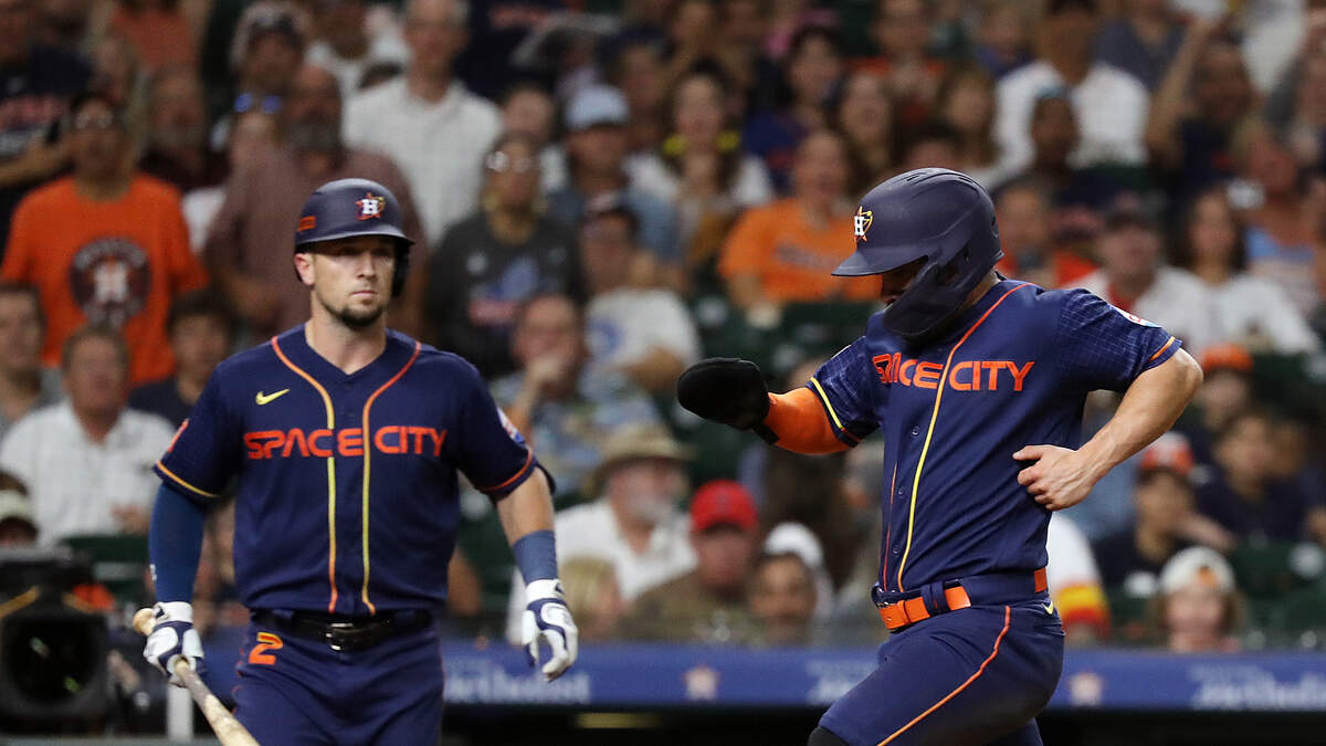 Jose Altuve (R) #27 of the Houston Astros scores on a wild pitch in the seventh inning against the Cleveland Guardians at Minute Maid Park on July 31, 2023 in Houston, Texas. Photo: Bob Levey / Getty Images Sport / Getty Images