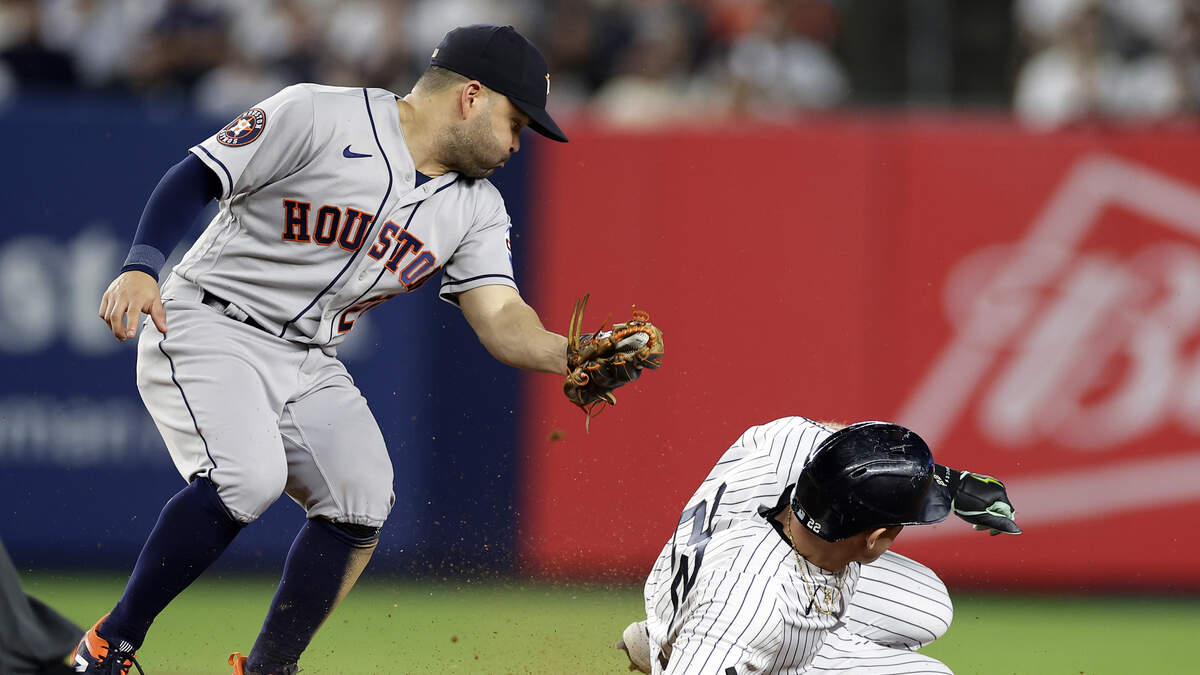 Harrison Bader #22 of the New York Yankees steals second base in front of Jose Altuve #27 of the Houston Astros during the sixth inning at Yankee Stadium on August 3, 2023 in New York City. Photo: Adam Hunger / Getty Images Sport / Getty Images