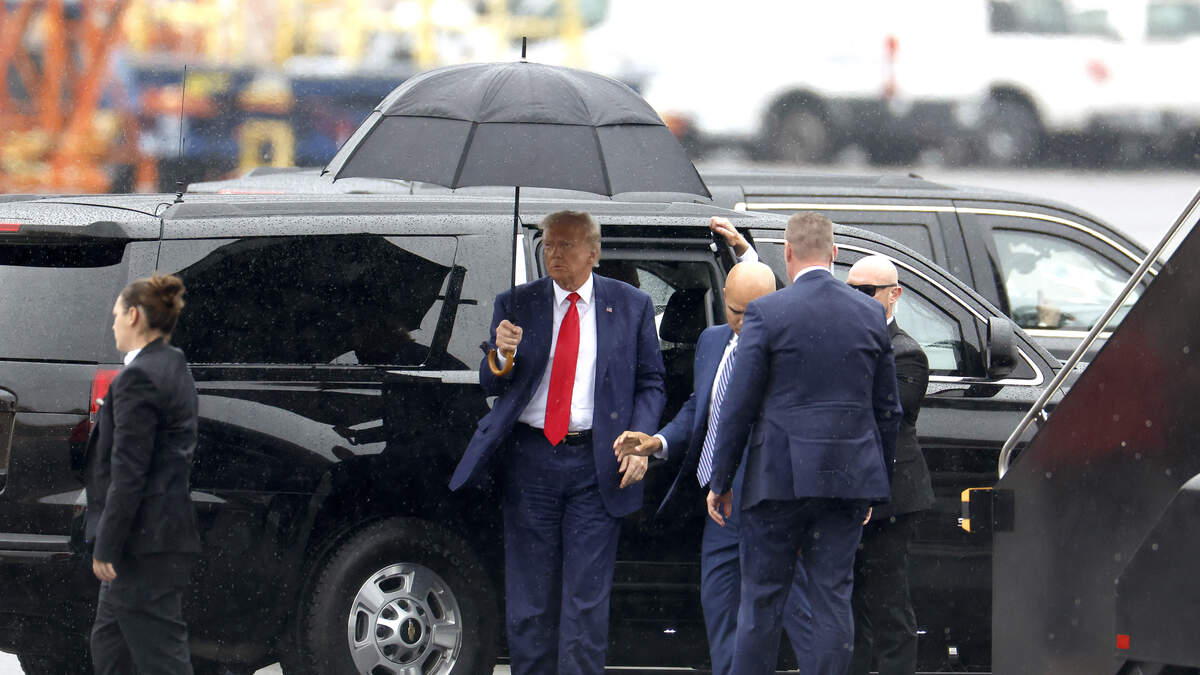 Former U.S. President Donald Trump holds an umbrella as he arrives at Reagan National Airport following an arraignment in a Washington, D.C. court on August 3, 2023 in Arlington, Virginia. Photo: Tasos Katopodis / Getty Images News / Getty Images