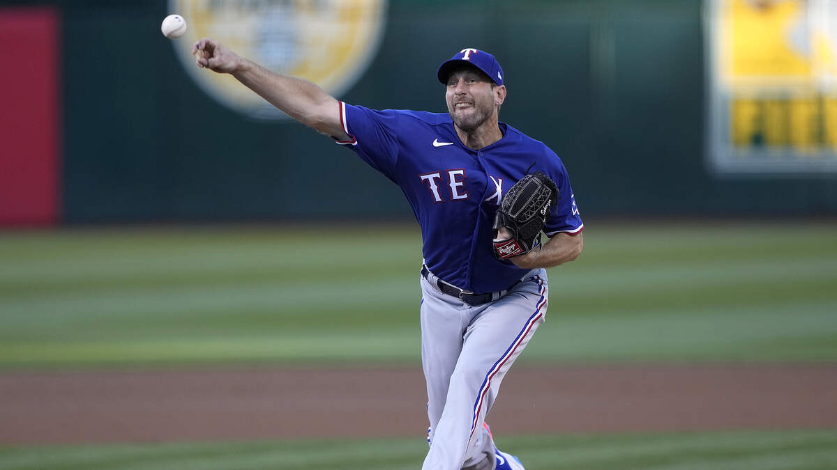 Max Scherzer #31 of the Texas Rangers pitches against the Oakland Athletics in the bottom of the first inning at RingCentral Coliseum on August 08, 2023 in Oakland, California. Photo: Thearon W. Henderson / Getty Images Sport / Getty Images
