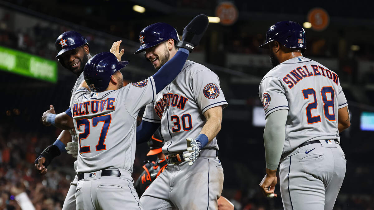 Kyle Tucker #30 of the Houston Astros celebrates with Jose Altuve #27, Yordan Alvarez #44, and Jon Singleton #28 after hitting a grand slam home run against the Baltimore Orioles at Oriole Park at Camden Yards on August 8, 2023 in Baltimore, Maryland. Photo: Scott Taetsch / Getty Images Sport / Getty Images