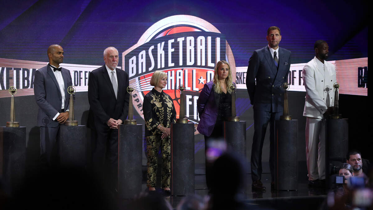 2023 inductees Tony Parker, Gregg Popovich, Becky Hammon, Dirk Nowitzki and Dwyane Wade react on stage during the 2023 Naismith Basketball Hall of Fame Induction at Symphony Hall on August 12, 2023 in Springfield, Massachusetts. Photo: Mike Lawrie / Getty Images Sport / Getty Images