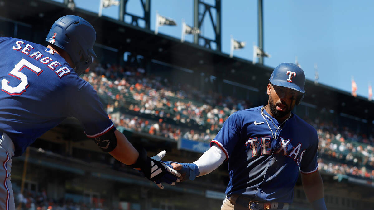 Ezequiel Duran #20 of the Texas Rangers celebrates with Corey Seager #5 after scoring on a balk by pitcher Camilo Doval #75 of the San Francisco Giants in the top of the ninth inning at Oracle Park on August 13, 2023 in San Francisco, California.Photo: Lachlan Cunningham / Getty Images Sport / Getty Images