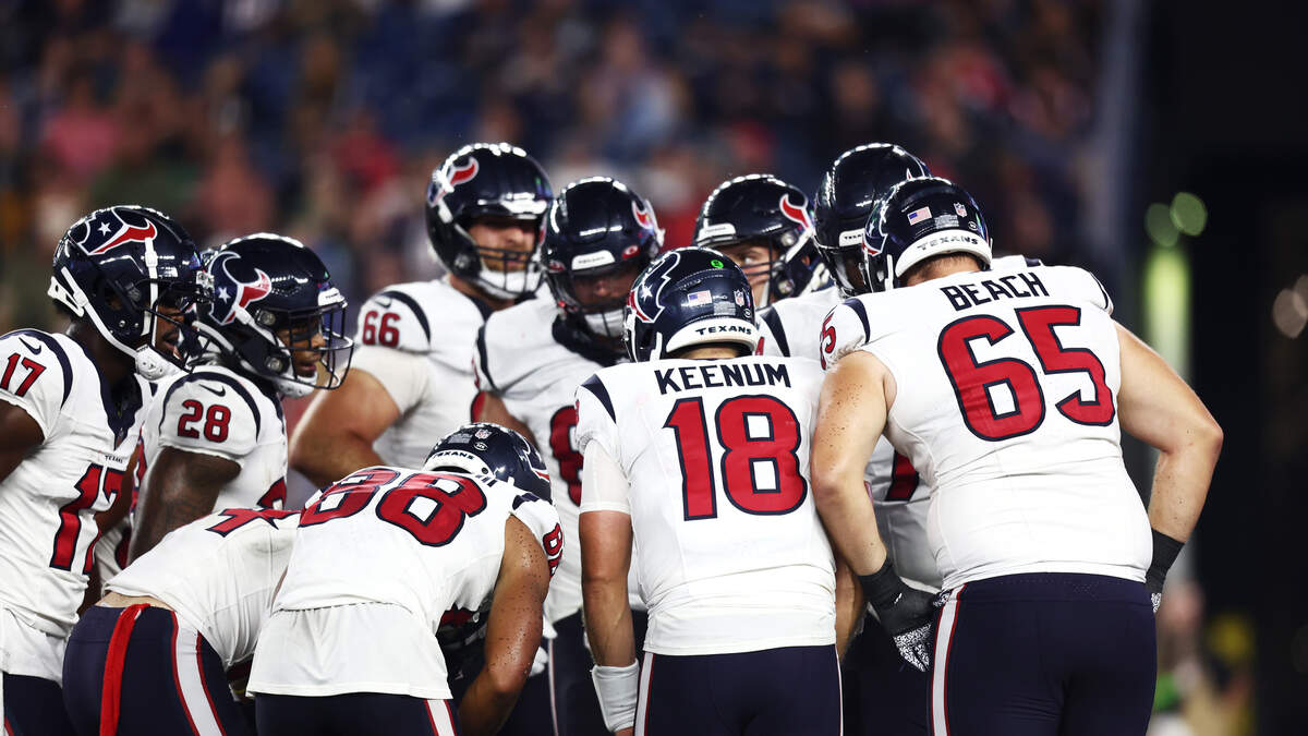 Quarterback Case Keenum #18 of the Houston Texans takes the huddle during the fourth quarter of the preseason game against the New England Patriots at Gillette Stadium on August 10, 2023 in Foxborough, Massachusetts. (Photo by Omar Rawlings/Getty Images)Photo: Omar Rawlings / Getty Images Sport / Getty Images