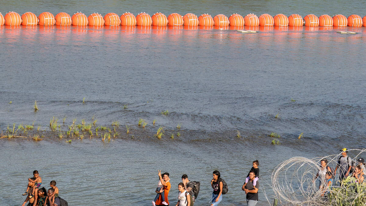Migrants walk between Concertina wire and a string of buoys placed on the water along the Rio Grande border with Mexico in Eagle Pass, Texas, on July 16, 2023, to prevent illegal immigration entry to the US. The buoy installation is part of an operation Texas is pursuing to secure its borders.Photo: SUZANNE CORDEIRO / AFP / Getty Images