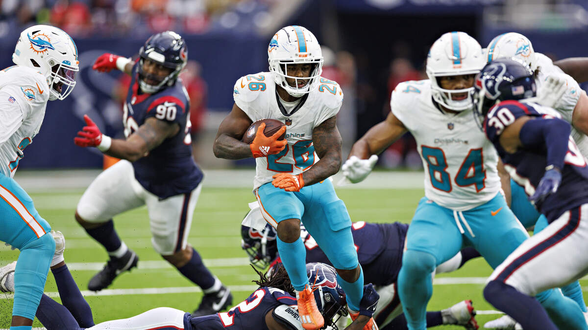Salvon Ahmed #26 of the Miami Dolphins runs the ball during a preseason game against the Houston Texans at NRG Stadium on August 19, 2023 in Houston, Texas.Photo: Wesley Hitt / Getty Images Sport / Getty Images