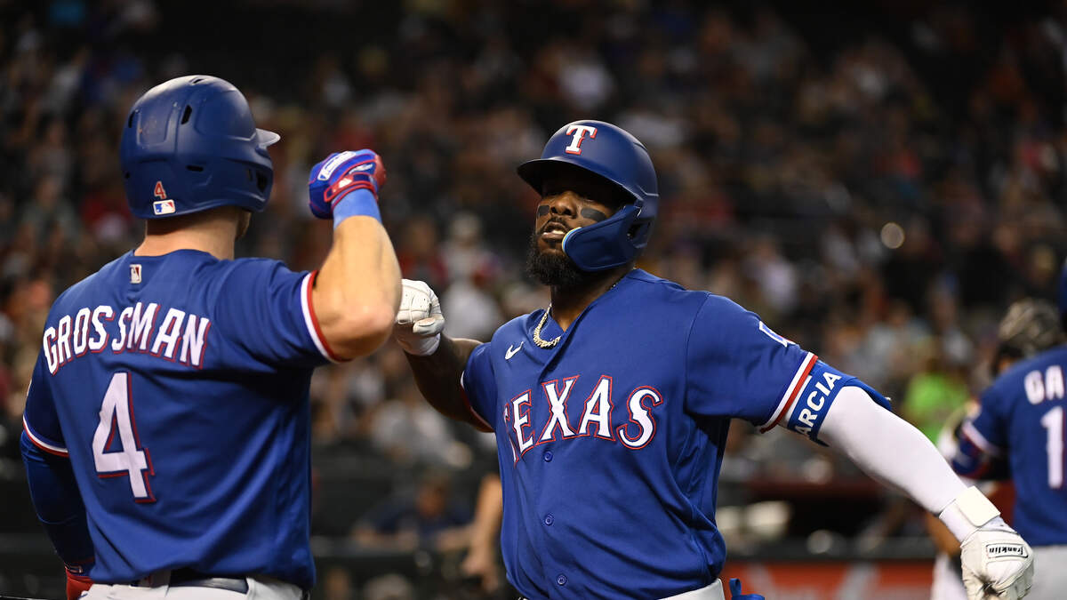 Adolis Garcia #53 of the Texas Rangers celebrates with Robbie Grossman #4 after hitting a solo home run against the Arizona Diamondbacks during the seventh inning at Chase Field on August 21, 2023 in Phoenix, Arizona. (Photo by Norm Hall/Getty Images)Photo: Norm Hall / Getty Images Sport / Getty Images