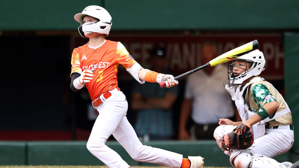 Heath Filipp #3 of the Southwest Region team from Needville, Texas hits a double during the third inning against the Asia-Pacific Region team from Taipei City, Chinese Taipei during the Little League World Series Consolation Game at Little League International Complex on August 27, 2023 in South Williamsport, Pennsylvania.Photo: Tim Nwachukwu / Getty Images Sport / Getty Images
