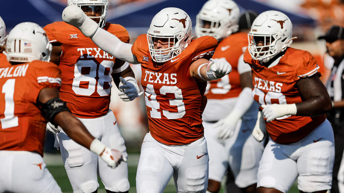 1 of 8 Jett Bush #43 of the Texas Longhorns celebrates after a fumble recovery in the second half against the Rice Owls at Darrell K Royal-Texas Memorial Stadium on September 02, 2023 in Austin, Texas. Photo: Tim Warner / Getty Images Sport / Getty Images