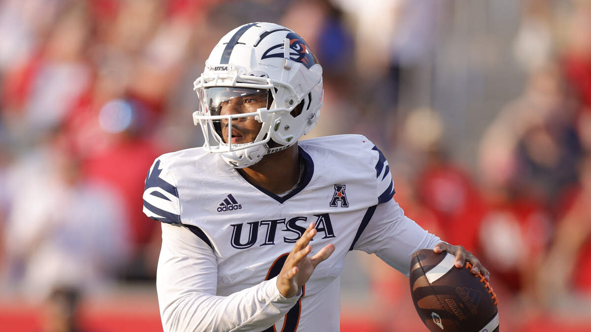 Frank Harris #0 of the UTSA Roadrunners looks to pass during the first half against the Houston Cougars at TDECU Stadium on September 02, 2023 in Houston, Texas. Photo: Carmen Mandato / Getty Images Sport / Getty Images