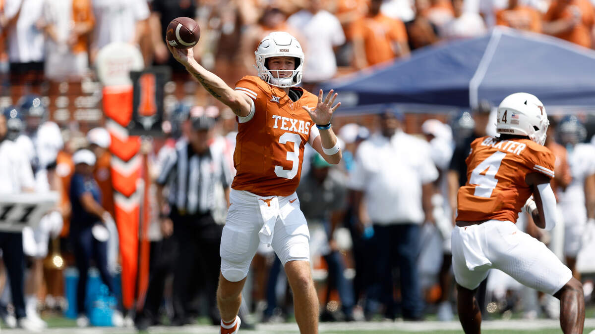 Quinn Ewers #3 of the Texas Longhorns throws a pass in the first quarter against the Rice Owls at Darrell K Royal-Texas Memorial Stadium on September 02, 2023 in Austin, Texas. Photo: Tim Warner / Getty Images Sport / Getty Images