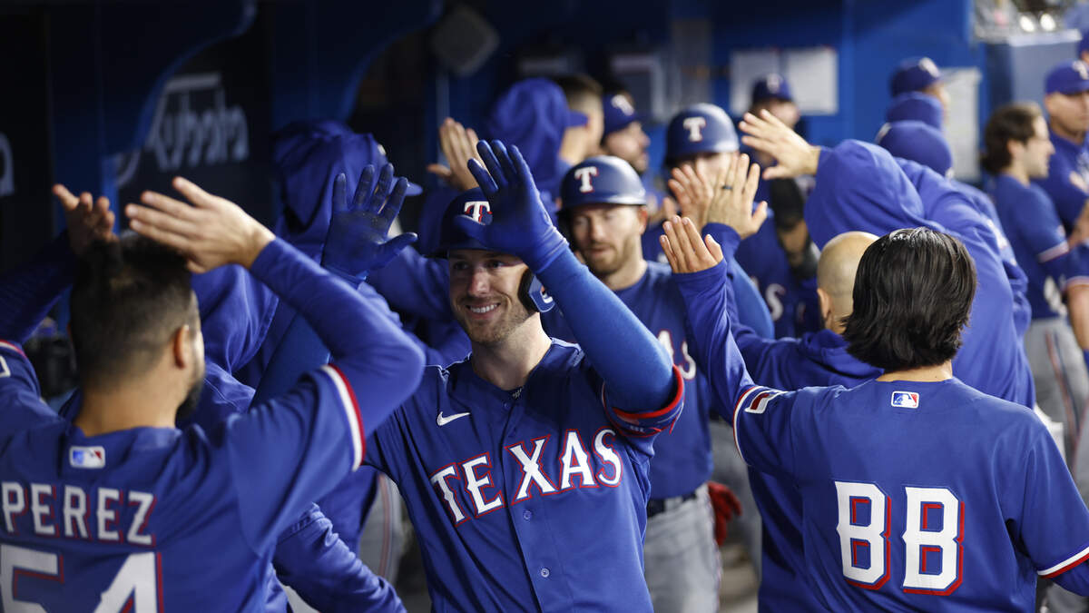 Mitch Garver #18 of the Texas Rangers celebrates his three-run home run in the ninth inning against the Toronto Blue Jays at Rogers Centre on September 13, 2023 in Toronto, Canada.Photo: Cole Burston / Getty Images Sport / Getty Images