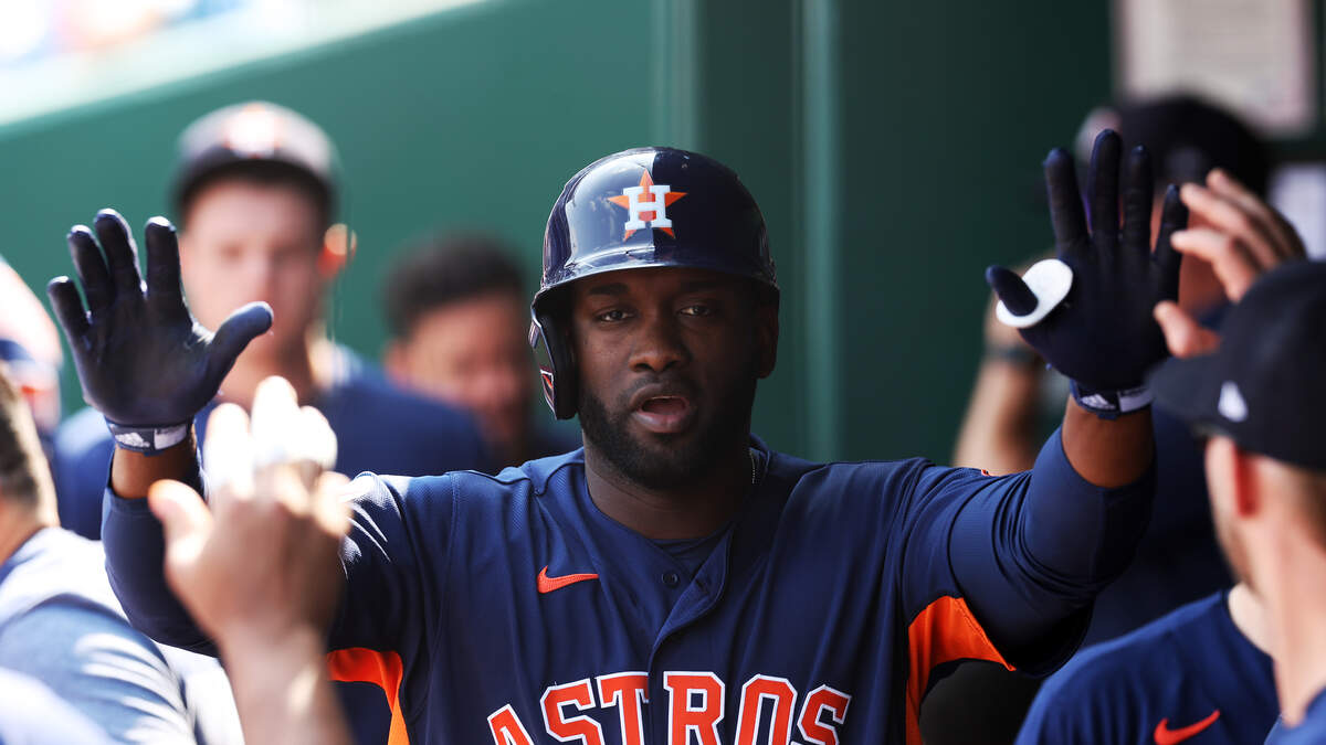 Yordan Alvarez #44 of the Houston Astros is congratulated by teammates in the dugout after hitting a home run during the 5th inning of the game against the Kansas City Royals at Kauffman Stadium on September 17, 2023 in Kansas City, Missouri. Photo: Jamie Squire / Getty Images Sport / Getty Images