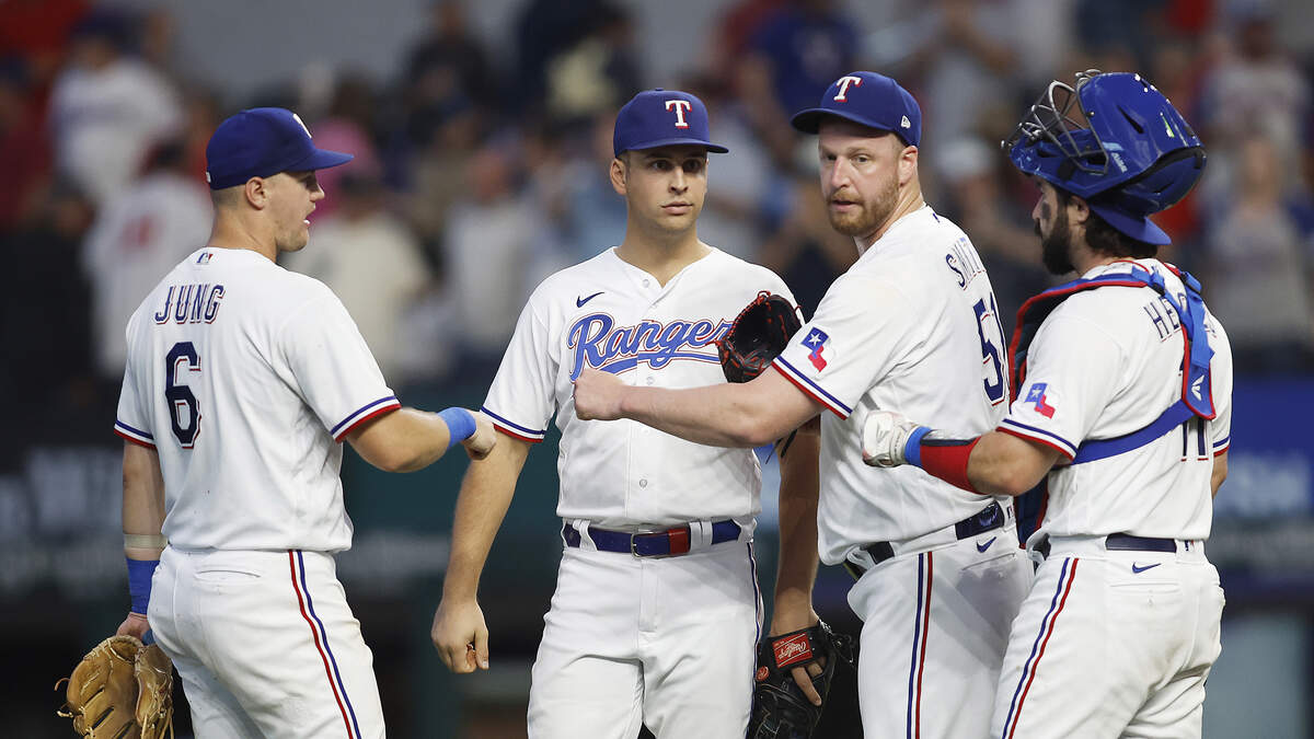 Josh Jung #6 of the Texas Rangers, Nathaniel Lowe #30, Will Smith #51, and Austin Hedges #11 celebrate after the 15-5 victory against the Boston Red Sox at Globe Life Field on September 20, 2023 in Arlington, Texas. Photo: Tim Heitman / Getty Images Sport / Getty Images