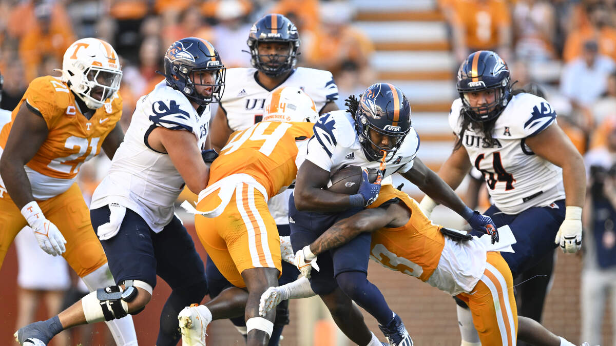Rocko Griffin #24 of the UTSA Roadrunners gets tackled by Wesley Walker #13 of the Tennessee Volunteers in the third quarter at Neyland Stadium on September 23, 2023 in Knoxville, Tennessee. Photo: Eakin Howard / Getty Images Sport / Getty Images