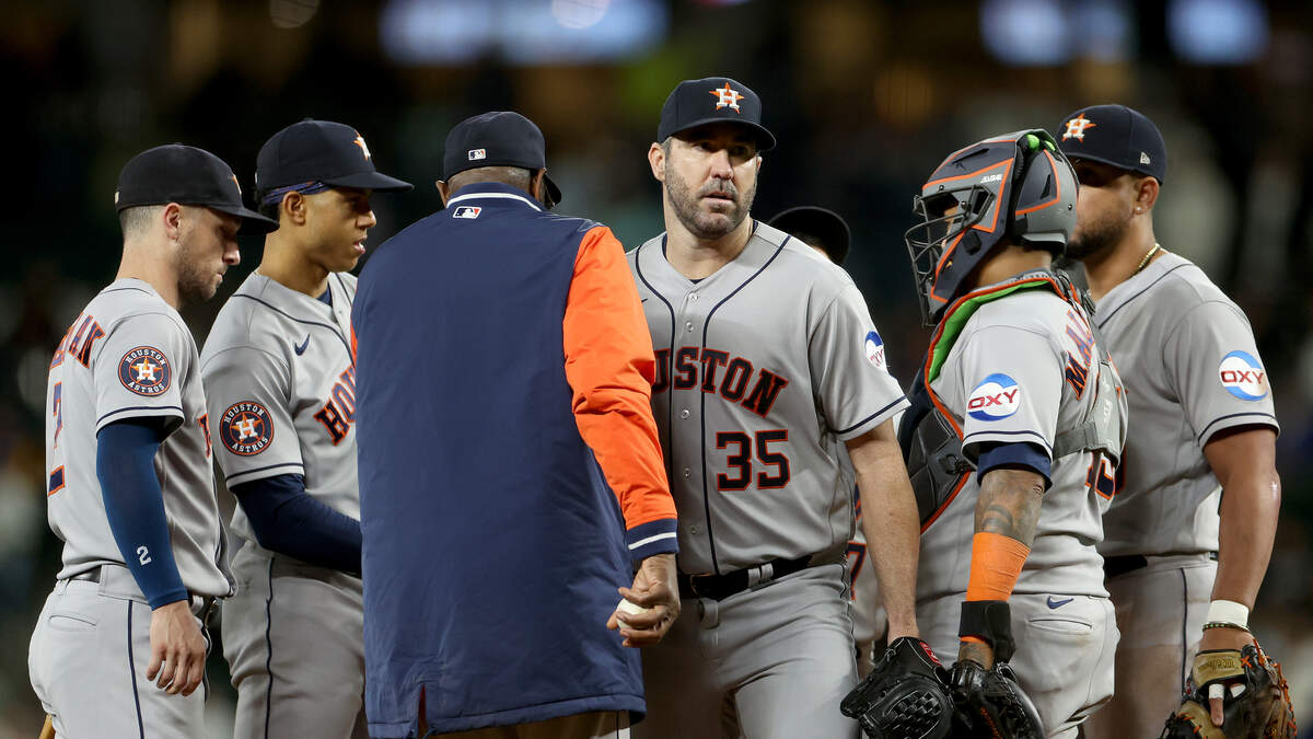 SEATTLE, WASHINGTON - SEPTEMBER 25: Houston Astros starting pitcher Justin Verlander #35 is taken out of the game during the ninth inning against the Seattle Mariners at T-Mobile Park on September 25, 2023 in Seattle, Washington. Photo: Steph Chambers / Getty Images Sport / Getty Images