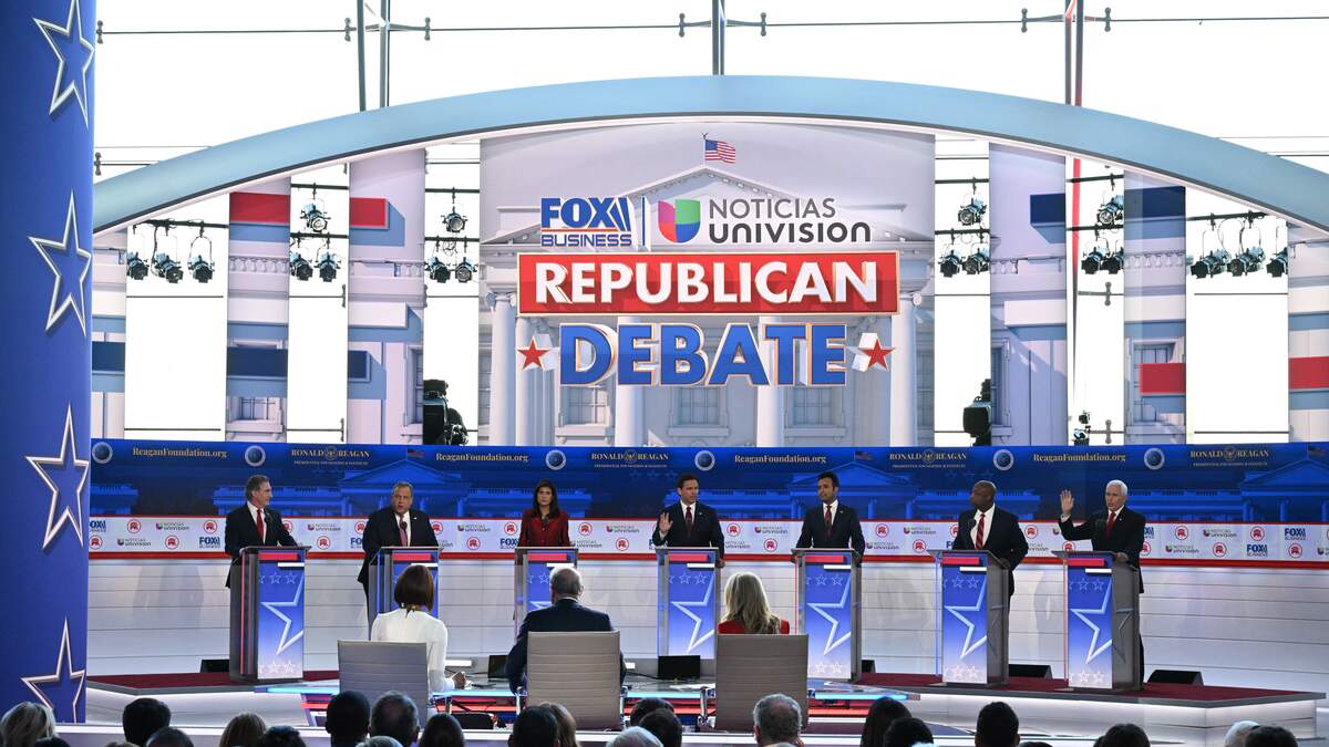 The debate is without former President Trump, the party's front-runner who met instead with striking UAW workers in Michigan.