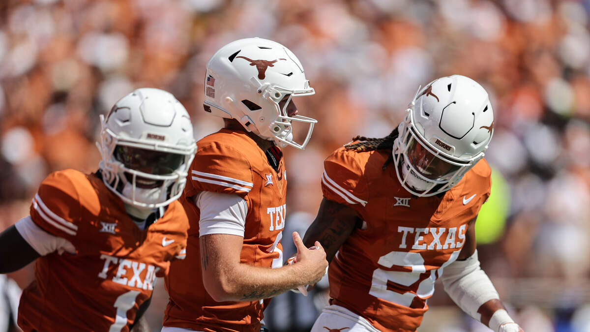1 of 8 Quinn Ewers #3 of the Texas Longhorns is congratulated after a rushing touchdown in the first quarter against the Kansas Jayhawks at Darrell K Royal-Texas Memorial Stadium on September 30, 2023 in Austin, Texas. Photo: Tim Warner / Getty Images Sport / Getty Images