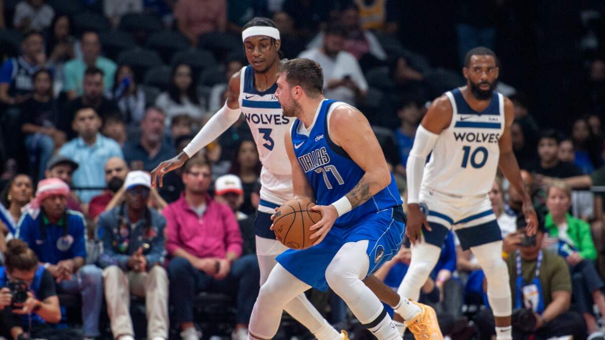 Dallas Mavericks' guard Luka Doncic #77 steps back for a shot during the NBA Preseason game Between the Dallas Mavericks and the Minnesota Timberwolves at the Etihad Arena in Abu Dhabi on October 5, 2023. Photo: RYAN LIM / AFP / Getty Images