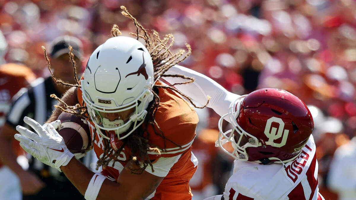 Jonathon Brooks #24 of the Texas Longhorn is hit by Kendel Dolby #15 of the Oklahoma Sooners in the fourth quarter at the Cotton Bowl on October 07, 2023 in Dallas, Texas.Photo: Richard Rodriguez / Getty Images Sport / Getty Images