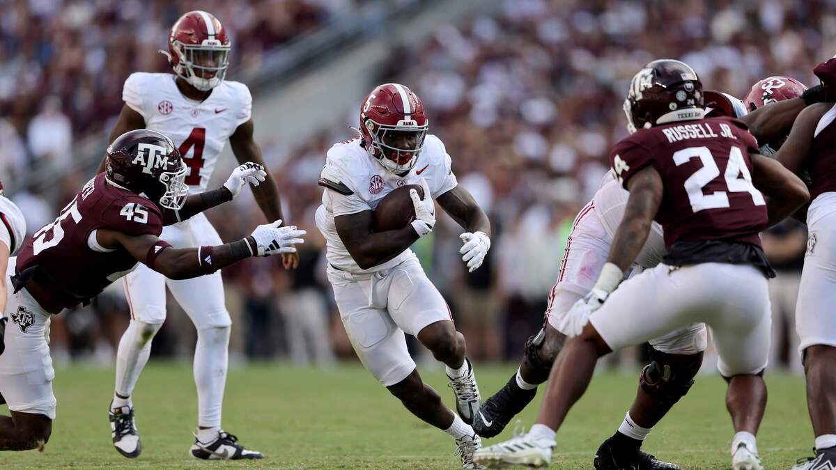 Roydell Williams #5 of the Alabama Crimson Tide runs the ball between Edgerrin Cooper #45 and Chris Russell Jr. #24 of the Texas A&M Aggies in the second half at Kyle Field on October 07, 2023 in College Station, Texas. Photo: Tim Warner / Getty Images Sport / Getty Images
