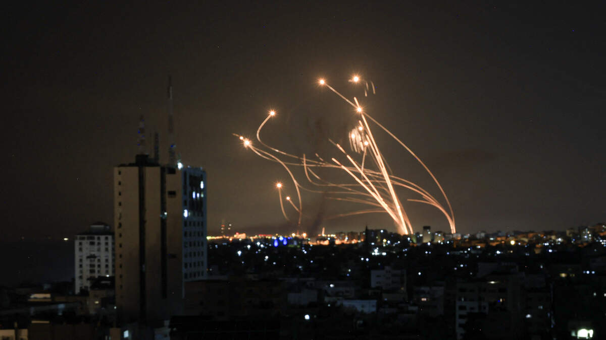 An Israeli missile launched from the Iron Dome defence missile system attempts to intercept a rocket, fired from the Gaza Strip, over the city of Netivot in southern Israel on October 8, 2023. Photo: MAHMUD HAMS / AFP / Getty Images