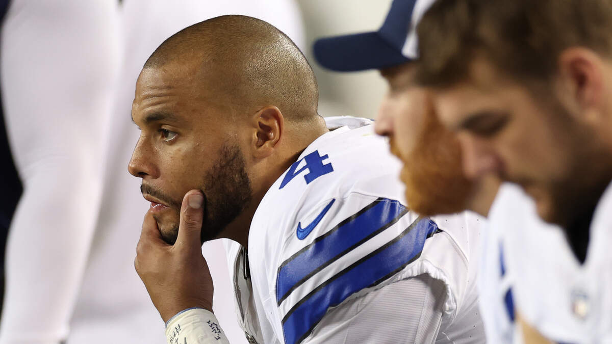 Dak Prescott #4 of the Dallas Cowboys reacts on the bench during the fourth quarter against the San Francisco 49ers at Levi's Stadium on October 08, 2023 in Santa Clara, California. Photo: Ezra Shaw / Getty Images Sport / Getty Images