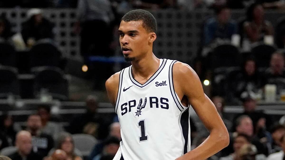 San Antonio Spurs' forward #01 Victor Wembanyama walks out of court at halftime during the NBA preseason game between the San Antonio Spurs and Miami Heat at the AT&T Center in San Antonio, Texas, on October 13, 2023. Photo: TIMOTHY A. CLARY / AFP / Getty Images