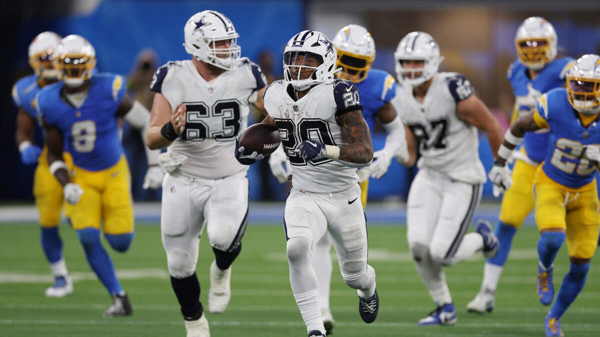 Tony Pollard #20 of the Dallas Cowboys runs after the catch in the fourth quarter against the Los Angeles Chargers at SoFi Stadium on October 16, 2023 in Inglewood, California. Photo: Harry How / Getty Images Sport / Getty Images