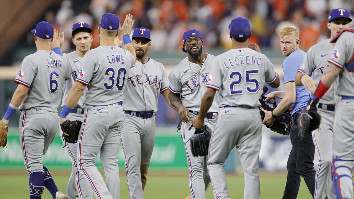 Jose Leclerc #25 of the Texas Rangers celebrates with his teammates after defeating the Houston Astros in Game Two of the American League Championship Series at Minute Maid Park on October 16, 2023 in Houston, Texas. Photo: Carmen Mandato / Getty Images Sport / Getty Images