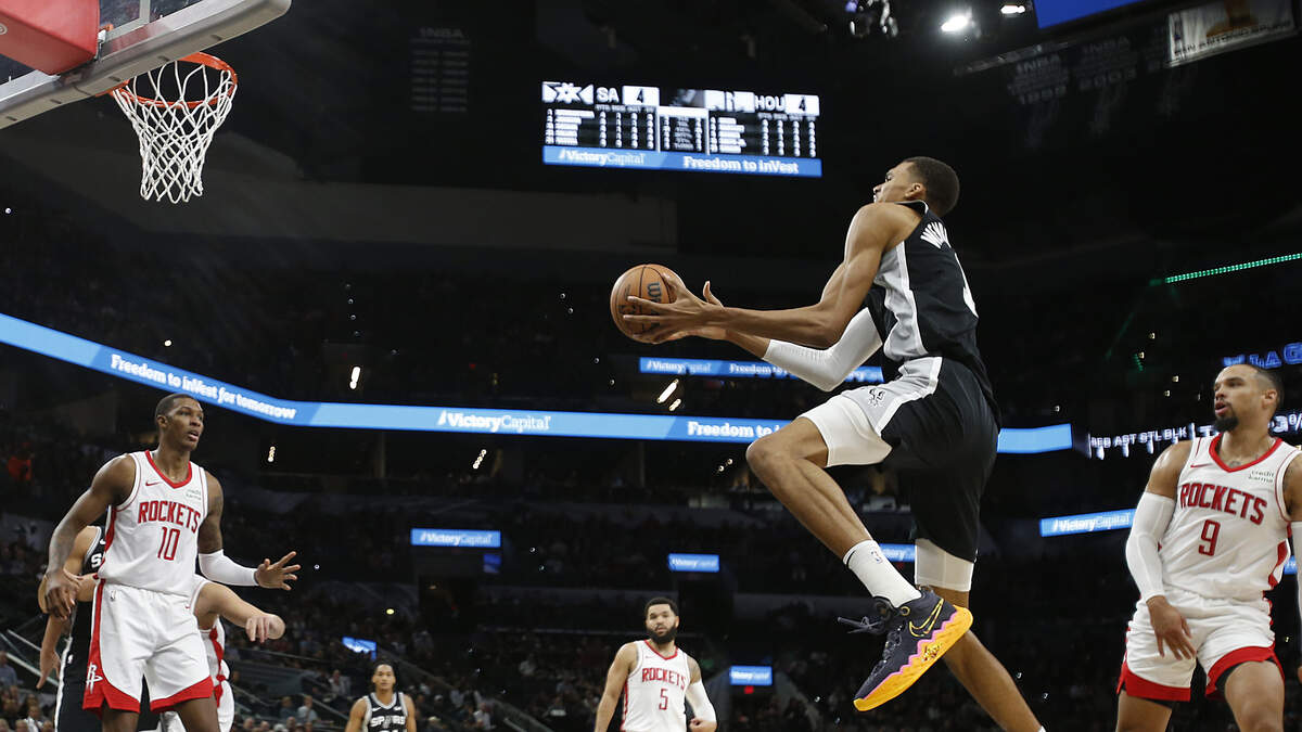 2 of 6 San Antonio Spurs' forward-center #01 Victor Wembanyama goes for a layup against Houston Rockets' Turkish center #28 Alperen Sengun during the NBA game between the Houston Rockets and the San Antonio Spurs in San Antonio, Texas.Photo: CHANDAN KHANNA / AFP / Getty Images