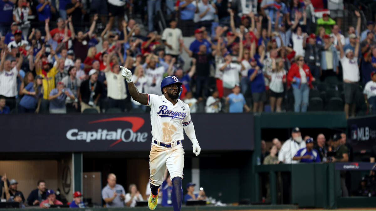 Adolis García #53 of the Texas Rangers celebrates as he rounds the bases after hitting a home run in the 11th inning to beat the Arizona Diamondbacks 6-5 in Game One of the World Series at Globe Life Field on October 27, 2023 in Arlington, Texas. (Photo by Jamie Squire/Getty Images)Photo: Jamie Squire / Getty Images Sport / Getty Images
